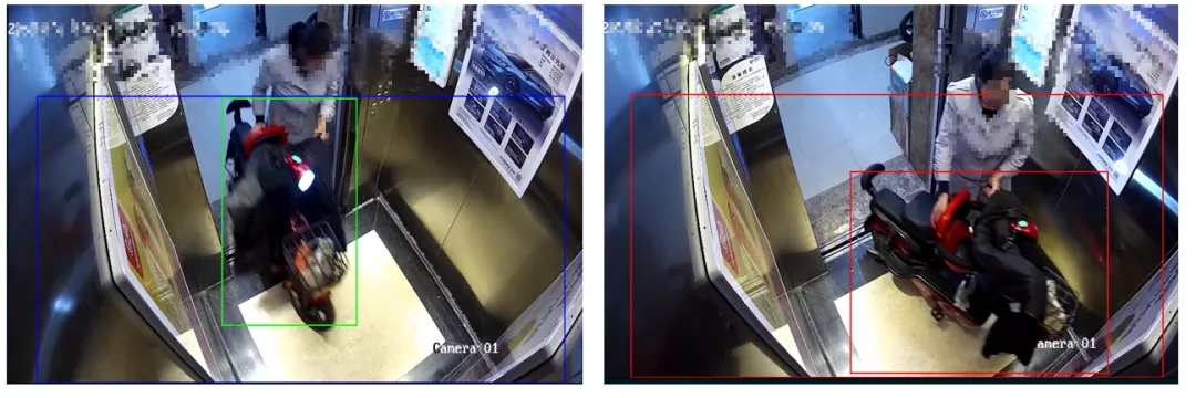 若电瓶车检测到并首次报警,规则框会变红,持续约3-4S;之后持续检测到电瓶车,则以绿色目标框叠加显示。