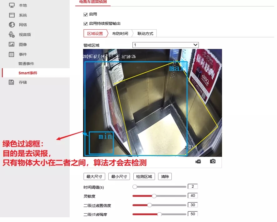 最小过滤框设置为画面大小的5-15%左右,具体可以参考正常电瓶车检出时,绿色框大小灵活设置过滤。