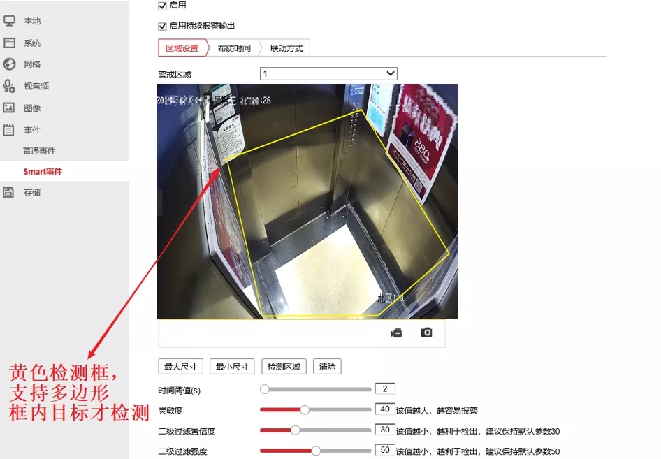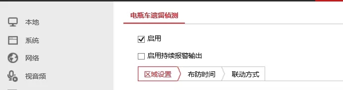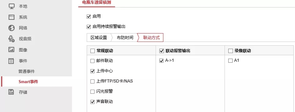 通过【事件】-【Smart事件】-【电瓶车遗留侦测】,勾选【启用】和【开启持续报警输出】,绘制检测区域。