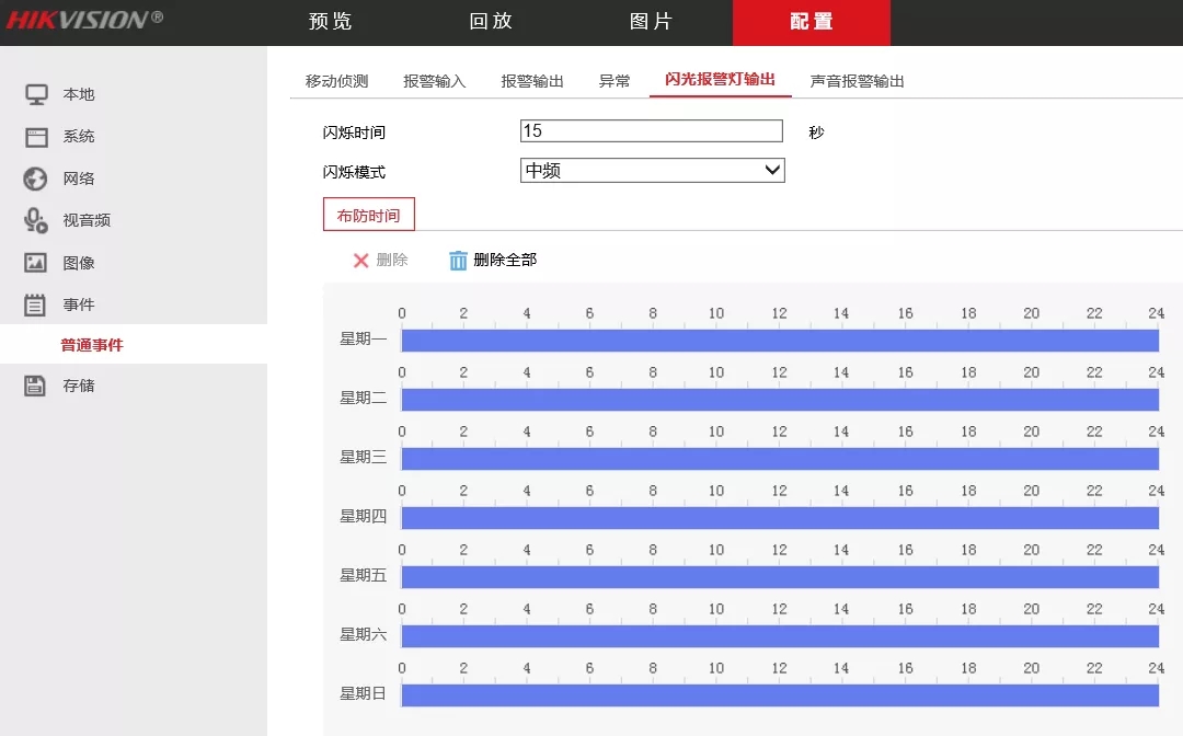 进入事件-普通事件-闪光报警灯输出页面,设置闪光灯闪烁时间和闪烁频率(闪烁频率太快时,即为常亮)。