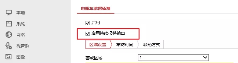 (1) 开启持续报警输出:只影响监控ALARM端子的报警输出,即:若算法持续检测到电瓶车目标在相应区域,则报警持续的输出;此时,报警输出的延时时间建议配置为5S。